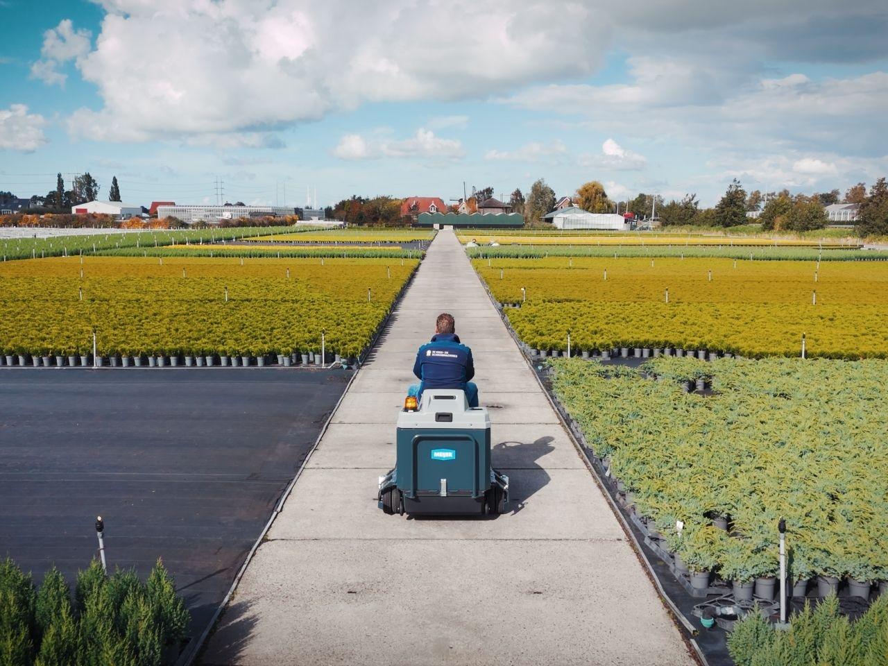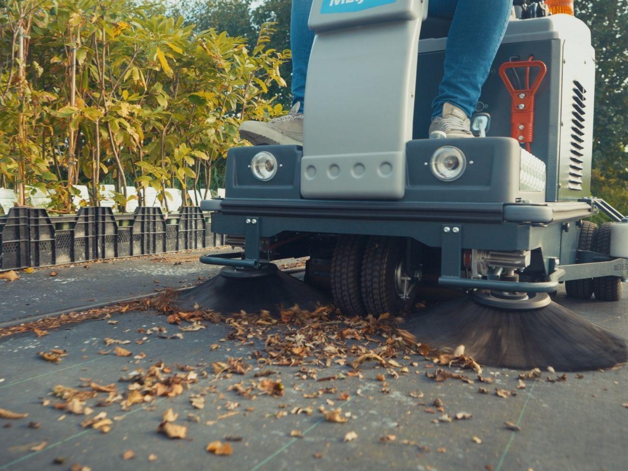 De VR950WD+ veegt tot 6.500 m² per uur en combineert een hoofdborstel van 70 cm met zijborstels tot maximaal 120 cm werkbreedte. Ideaal voor gangpaden op worteldoek, krappe paden tussen teeltgoten, logistieke routes in de kas en het erf rond de kas, parkeerplaatsen of laadkuilen. De dikke foambanden verdelen de druk en voorkomen spoorvorming of beschadiging van kwetsbare ondergronden.